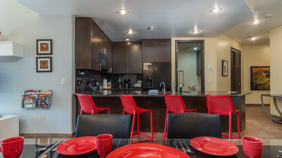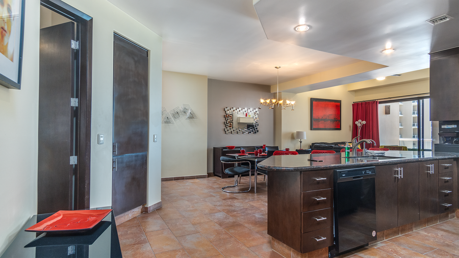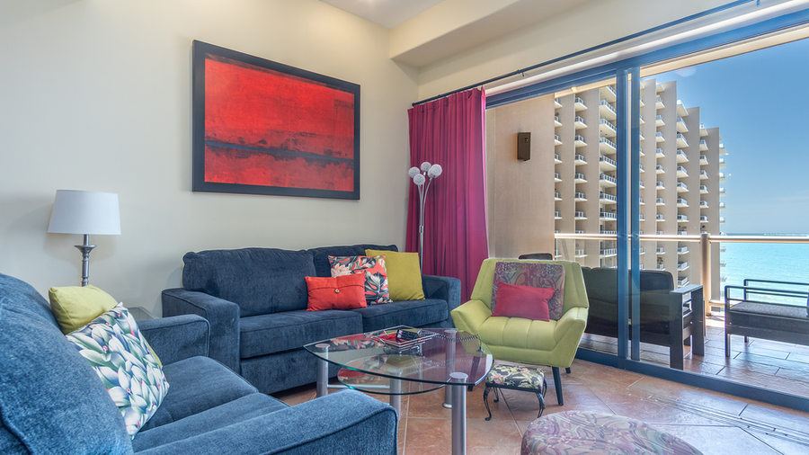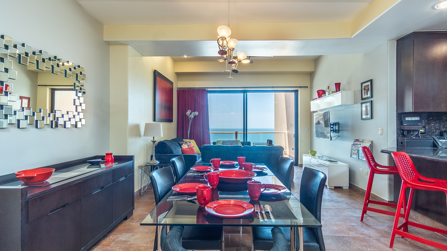 Cortez 605 The Martini Condo is a fun oceanfront condominium! Picture sophisticated drinks on the balcony as the Mexican sun melts into the ocean. Inside, the decor is colorful and classy, with a richly pointed bathroom, enticingly private bedroom, and the perfect kitchen/dining area.