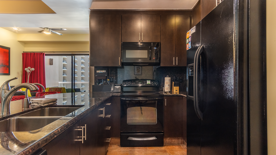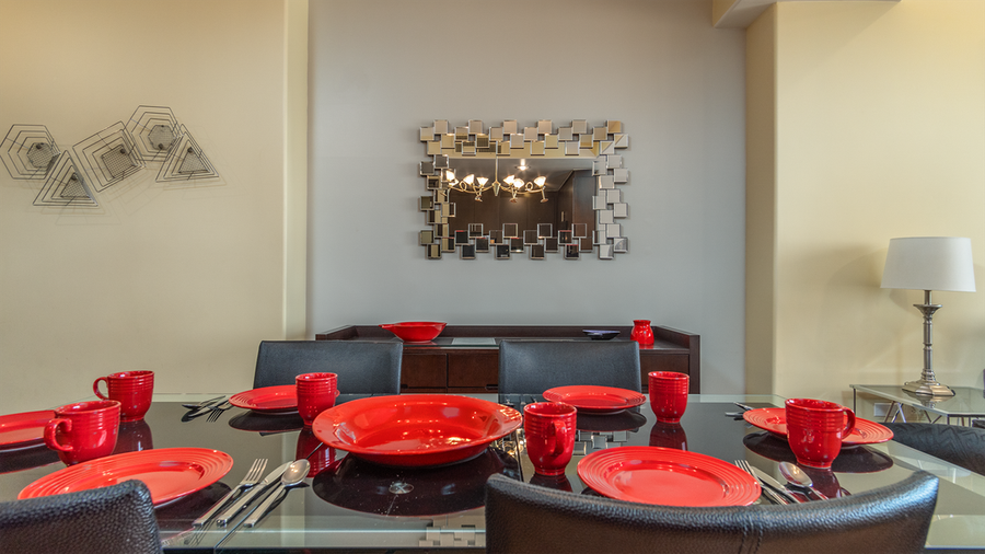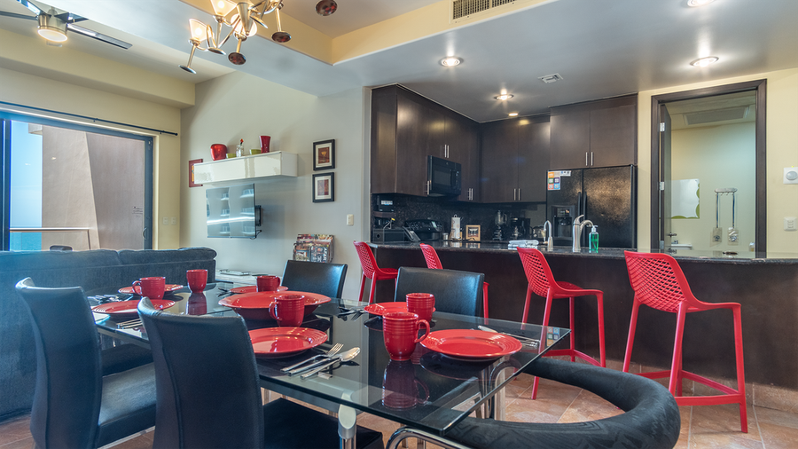 The vibe here is professional Chef all the way. Dark cabinets, counters, and appliances create a sleek cooking environment. All appliances like refrigerator, stove, microwave, coffeemaker and more can be found here. You will have all of the cookware you could want, and dinnerware as well. The countertop really is the center of this unit, and it is provided with vibrant raised high backed chairs for a perfect spot to hang out with the Chef! The large dining table accepts six.