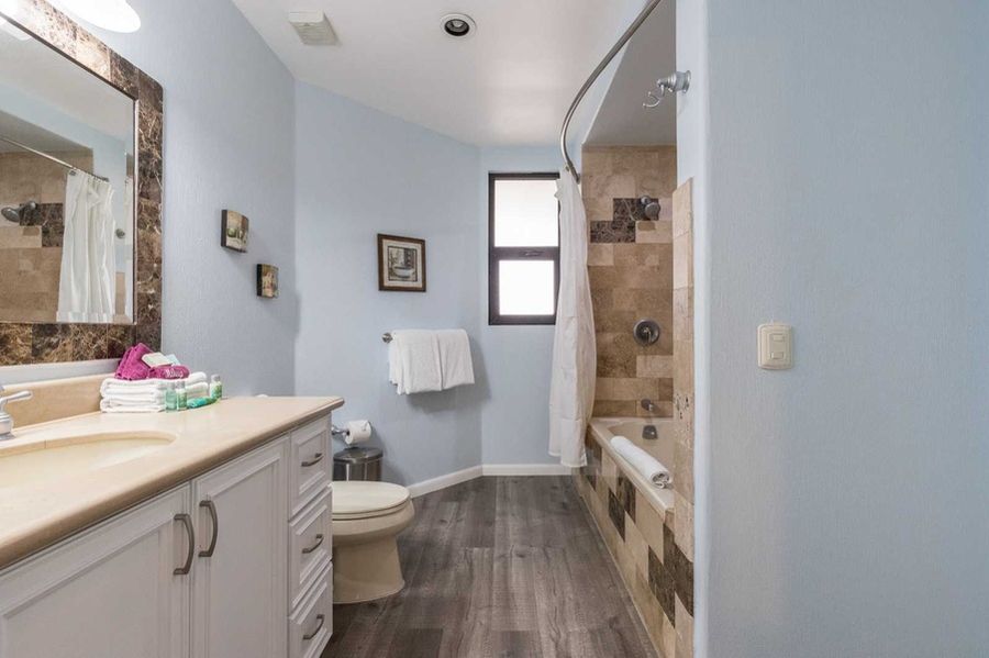 ~ Bathroom has a combined shower and bathtub. There is also a mirror topped vanity.
