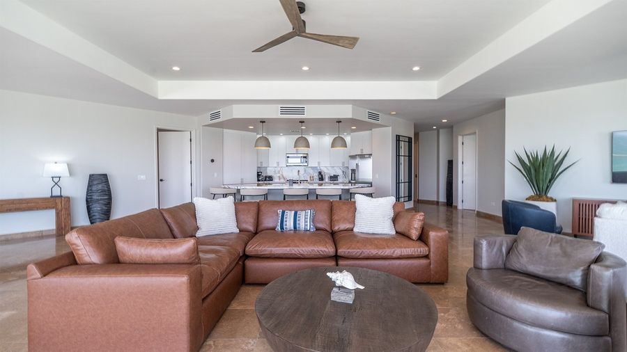 Grand leather sofa facing out to the ocean for great sunset times.