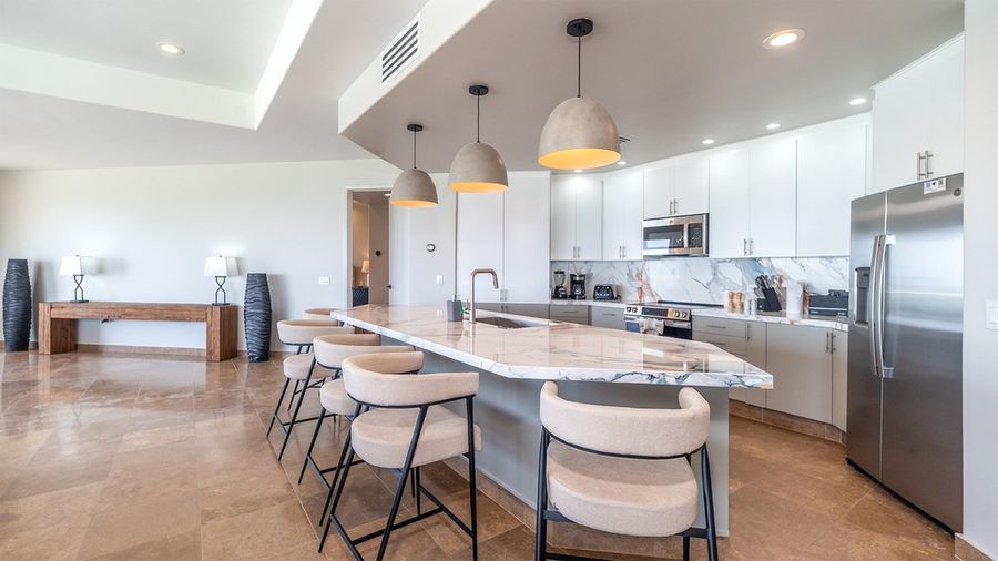 Roomy kitchen island with bar stools and custom drop lighting — a great spot for gathering.