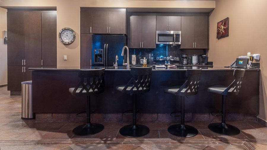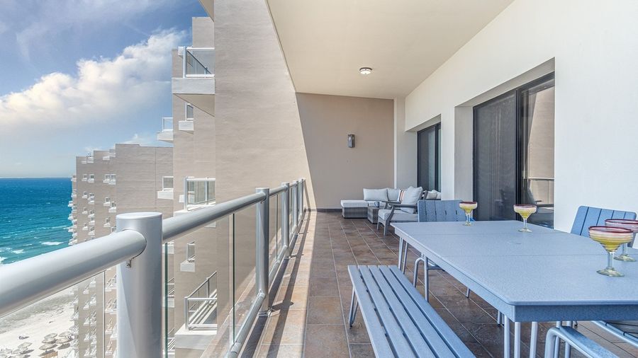 The expansive balcony takes in the views and has a dining table, along with a sectional seating area. Inside, you will find a dining table for six and a kitchen with a raised counter and bar stools, along with a complete complement of appliances, large and small.