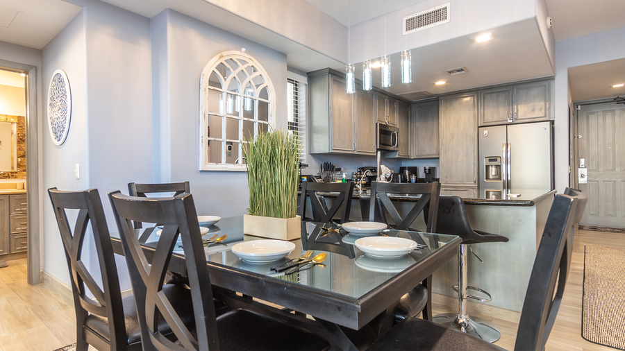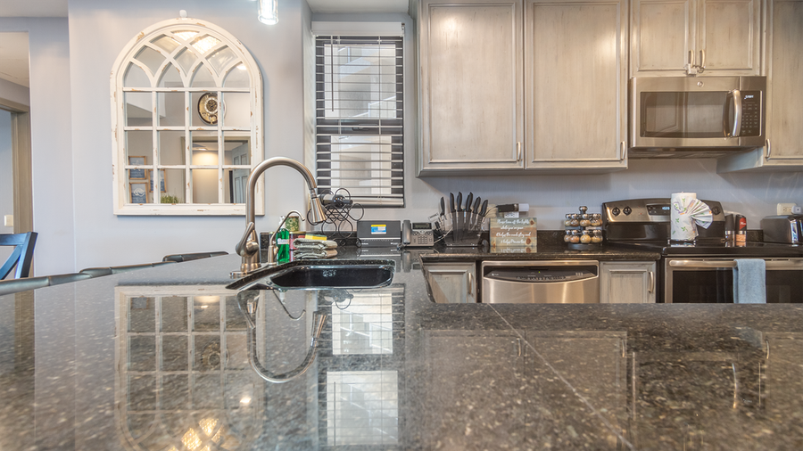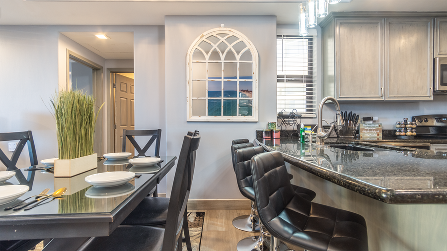 This condo provides a top shelf kitchen, with rich dark counter tops, the latest appliances, and a comfortable space to prepare and enjoy your meals.