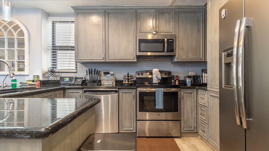 - Appliances include a stove dish washer, oven, sink, coffee maker, refrigerator, set of knives