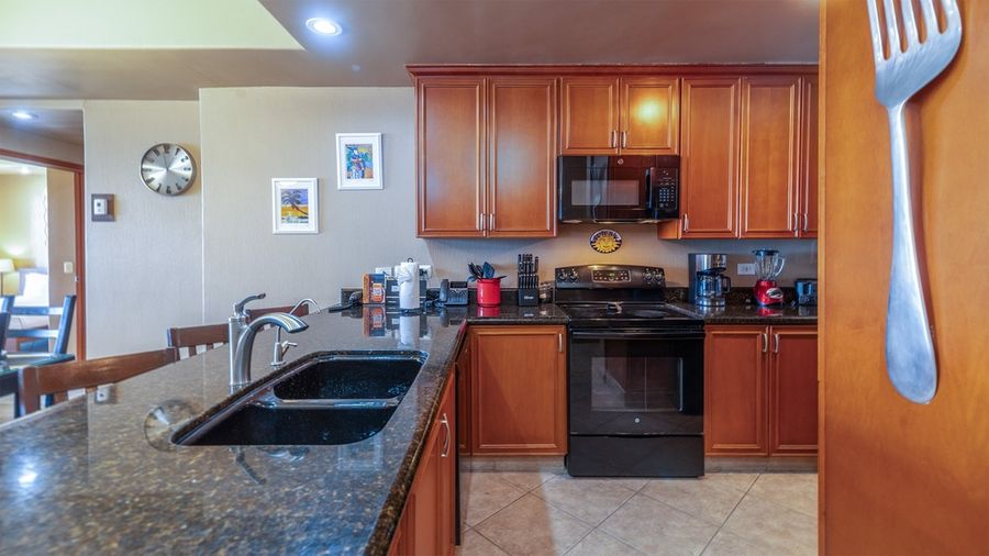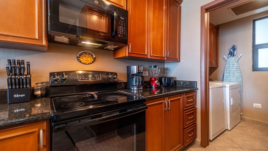 The kitchen is appointed with appliances large and small, along with full cookware, and dinnerware as well. A separate room houses the washer and dryer, along with a sink. The master bedroom has a king sleigh bed and walk-in closet with a small safe. The attached master bathroom is elegant in travertine tile, with its shower stall, separate bathtub, and vanity with two sinks and a large mirror. The guest bedroom opens onto the balcony as well, has a TV, and a separate hall accessible bathroom with vanity and shower.