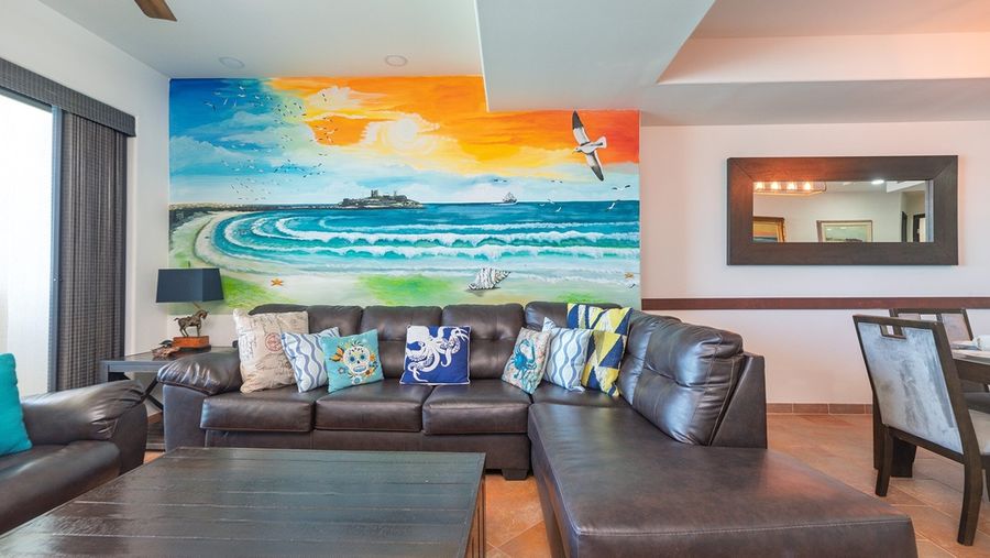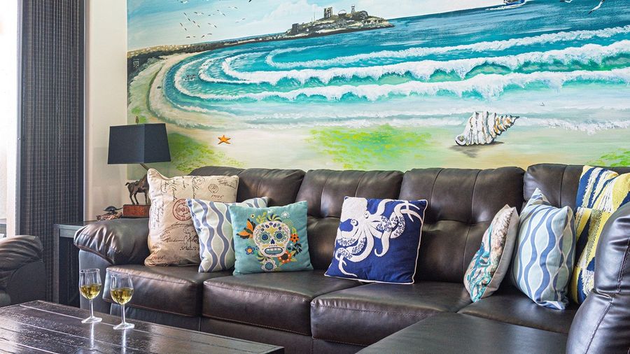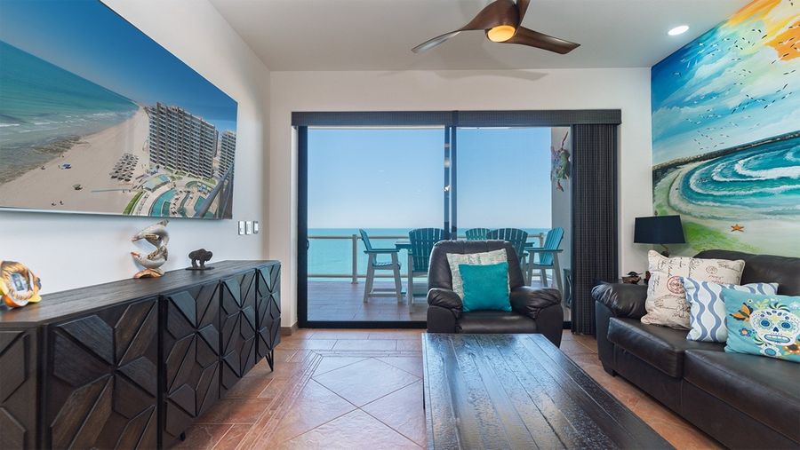 This truly colorful condo offers many attractive details, including a custom ocean mural that really enhances the beach vibes. Your balcony juts out above the beach, as it is one of the closet to the ocean. Coronado 1407 is a two bedroom, two bathroom condominium, offering a deluxe beach vacation experience.