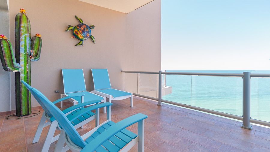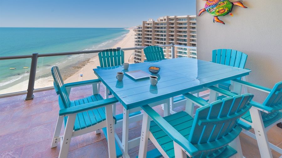 Step out on the balcony and experience the beach in its fullest. You seem to hang right above the sand in Coronado 1407. Views along the beach are unobstructed. Everyone can find their favorite spot on a balcony that offers two chaise lounge chairs, a pair of Adirondack chairs, and a raised cafe style dining that accommodates six. The cool part is that all the furnishings are done in a bright ocean turquoise color.