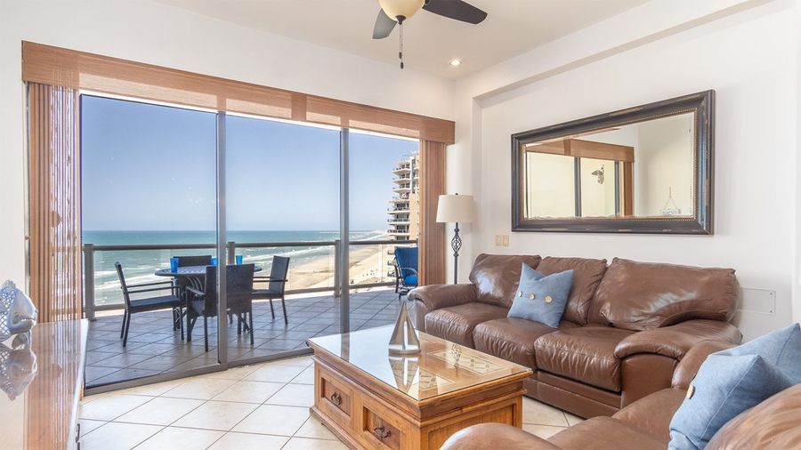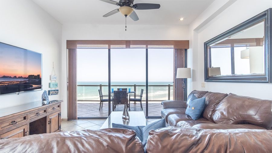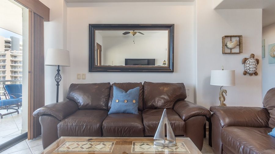 Leather sofas add a touch of style to the living room, which has double sliding glass doors onto the patio. And what a patio! Spacious and furnished with a dining table, and two separate upholstered sofa seating areas. Each bedroom presents queen bed, TV, dresser, closet space as well.