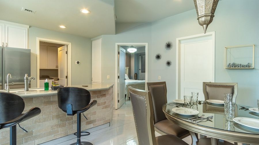 The bedroom features a King sized bed, TV, dresser, and closet. In the attache bathroom is a shower and vanity with mirror. The living room area has stylish dining table for four, and swivel chairs at the kitchen counter. The kitchen features stainless steel appliances, all cookware and small appliances as well. There is a separate room attached to the kitchen with an additional sink, washer, and dryer.