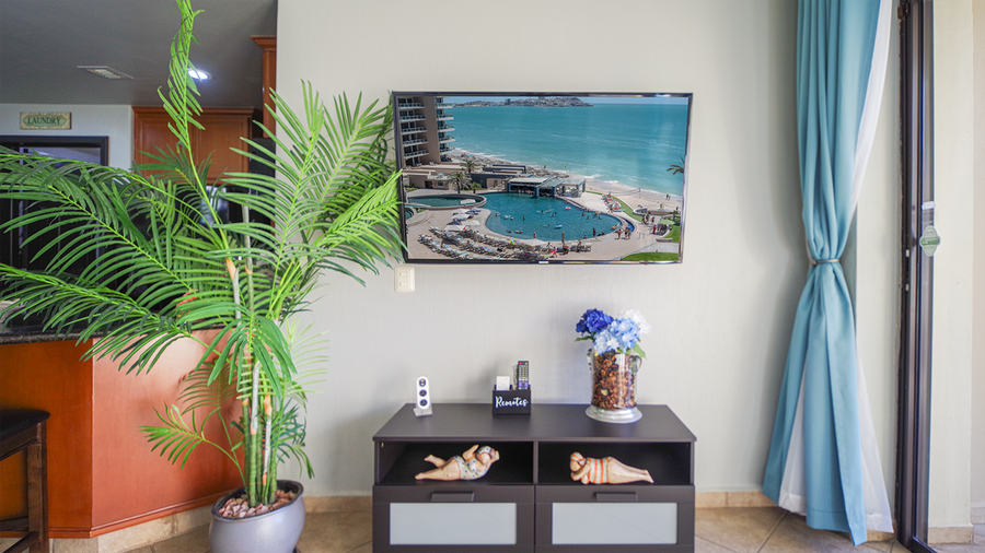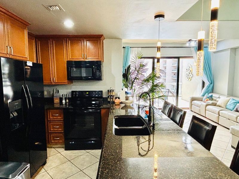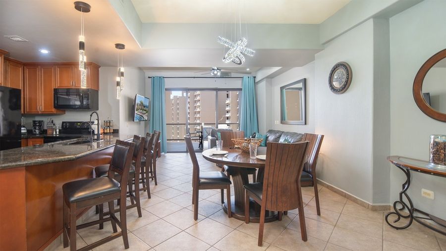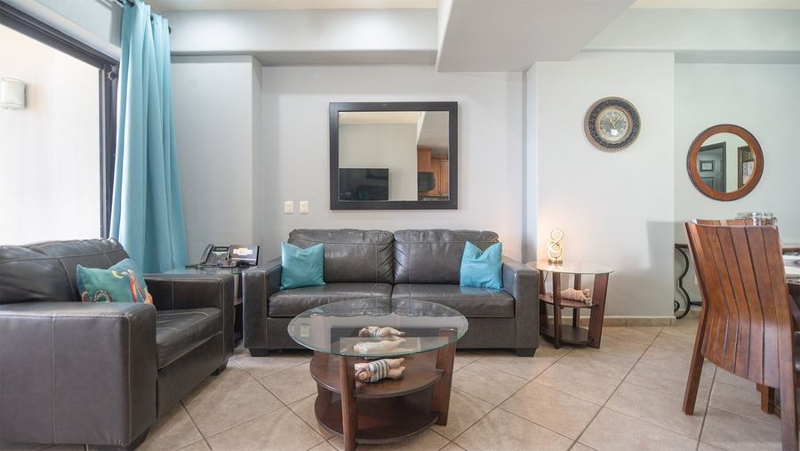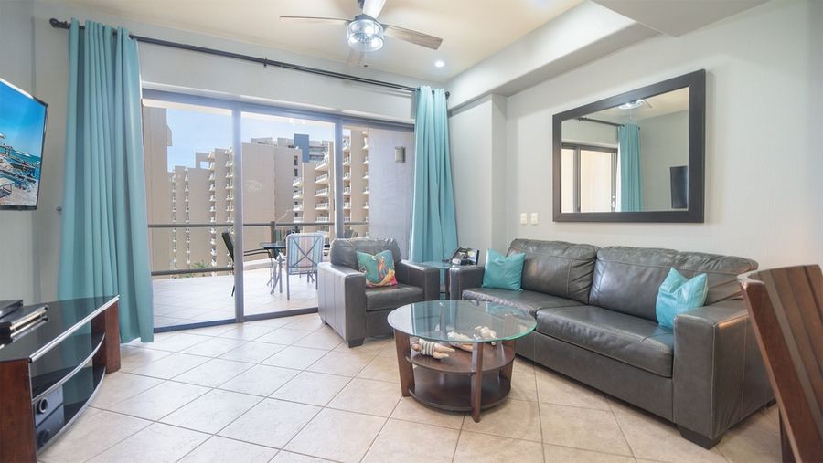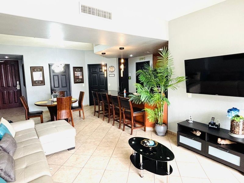 Great one bedroom condominium in Topaz Tower, Phase One of Las Palomas Beach and Golf Resort. Main room combines sofa in living room, balcony access, TV, dining table for four, and an elegant complete kitchen with dark granite and cherry cabinets. All appliances. Separate room for washer and dryer. Bedroom with king bed, dresser, TV, closet with small safe. Attache is the bathroom with mirror topped vanity and shower.