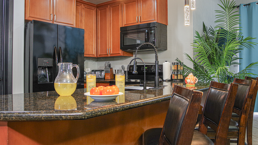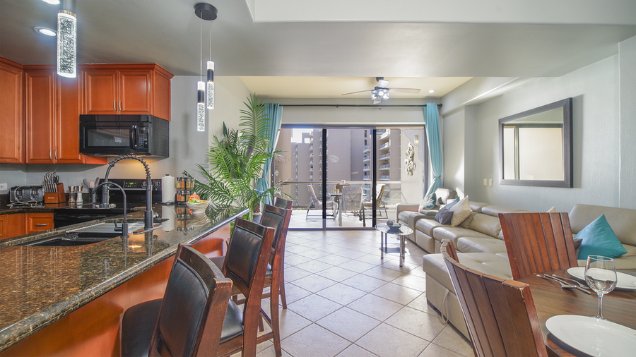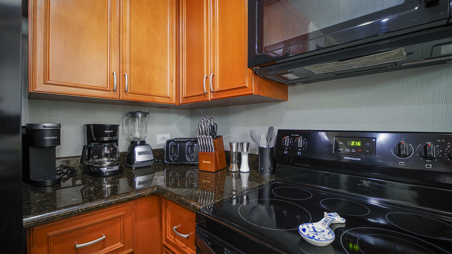The main room combines a comfortable living area made up of a leather chair and sofa, with TV and sliding glass doors that open onto the balcony. There is a dining table there for intimate breakfasts. The bedroom offers a king sized bed and attached bathroom done in granite tile, with a shower and bath, and vanity. The kitchen has a large counter lined bar raised seats.