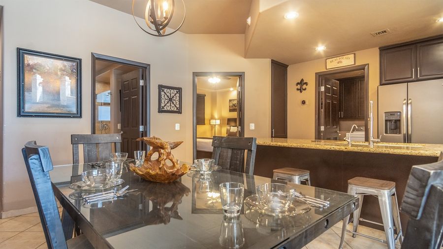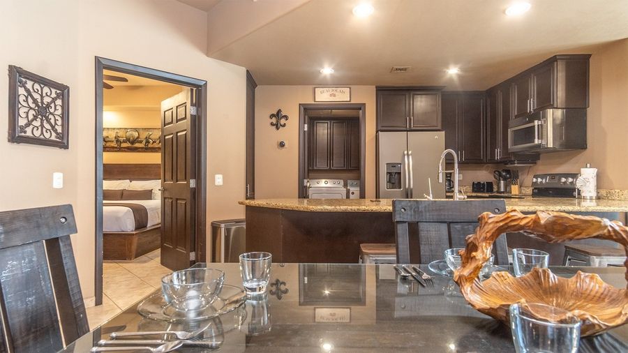 The kitchen has rich dark cabinets and granite counters, along with bar stools at the counter top, full appliances, and lots of cookware and dinnerware too. The balcony brings the outside to you, and there is a dining table that seats four.