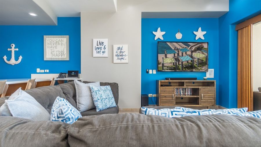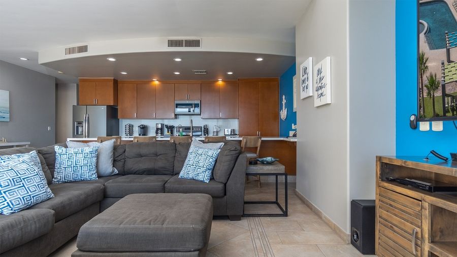 The main balcony opens up incredible views, detailed with two chaise lounge chairs and an upholstered sofa seating area. The truly modern kitchen has it all, with full appliances, cookware, large counter and additional seating. Her you will also find a laptop for checking emails. Etc. The living room has a massive sectional sofa that converts to a bed, and a wall mounted TV. The dining table provides great views by the balcony windows.