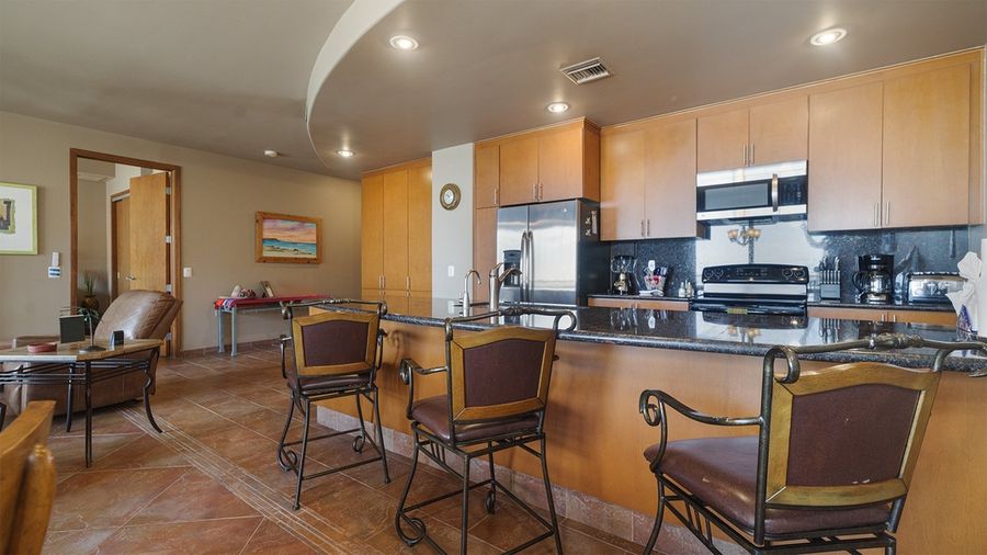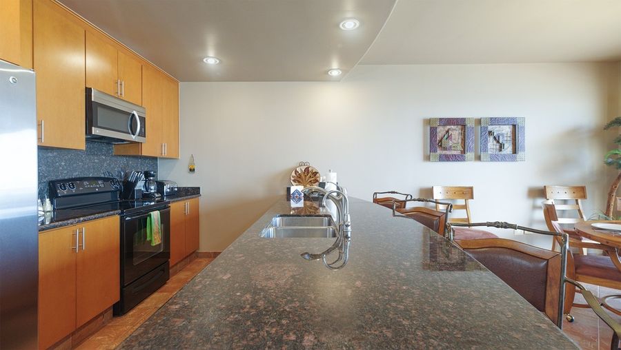 Experience luxury in this three bedroom condominium at the Las Palomas Beach and Golf Resort. A wide open main room brings in the beach light through a wall of glass. A leather sofa defines the living room area, and adjacent is a dining table, seating four.
