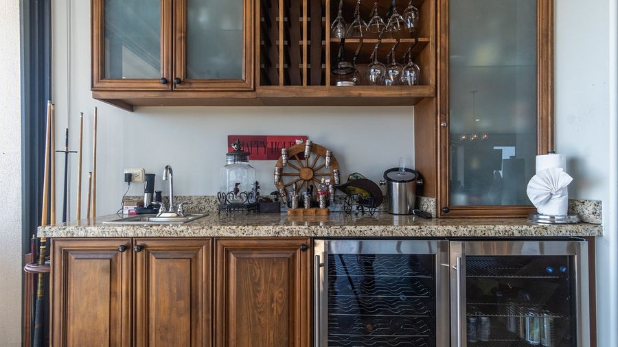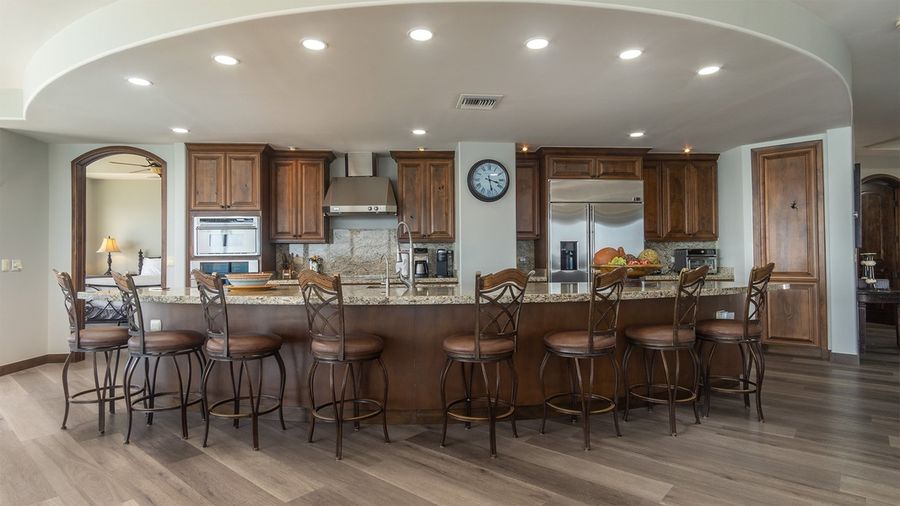 The kitchen is grand and open to the units main room. The border of the kitchen is set by a massive curved kitchen island the is home to an array of high backed chairs, the perfect spot to get the party started. Full appliances, cookware, and complete dinnerware as well in th many cabinets.