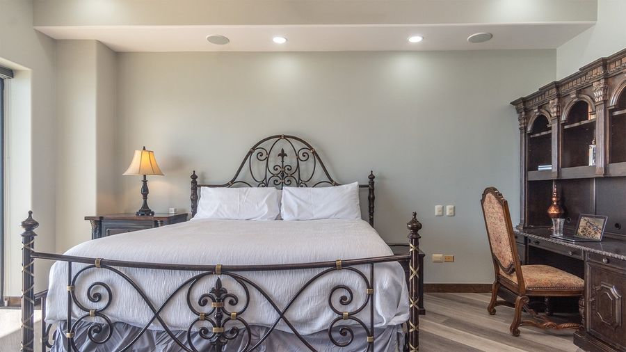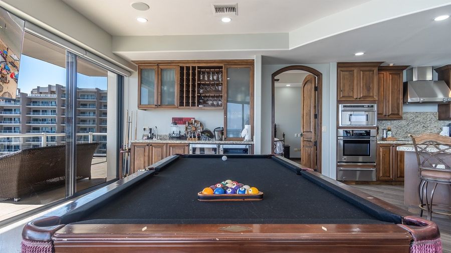 Coronado 1108 Enchanting four bedroom unit high above Las Palomas Beach and Golf Resort. The balcony wraps around to provide views of both the east and west sides of Sandy Beach, taking in everything from the city skyline to the ultimate sunset views. The main room encompasses a living room adorned with comfortable sofas and chairs, with a wall mounted TV. There is a panoramic kitchen with island and many bar stools. The dining table is a unique circular table with curved benches to accommodate many guests. Along the floor to ceiling windows, you encounter a pool table, along with a bar and another wall mounted TV.