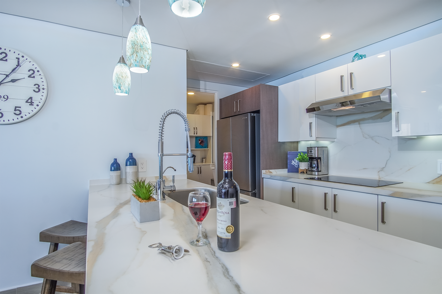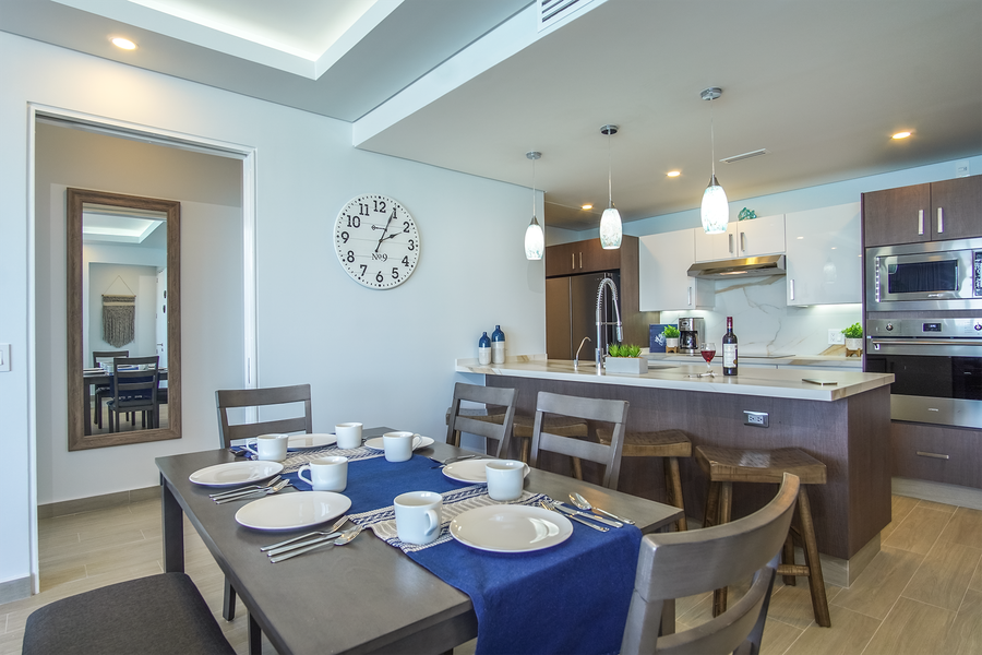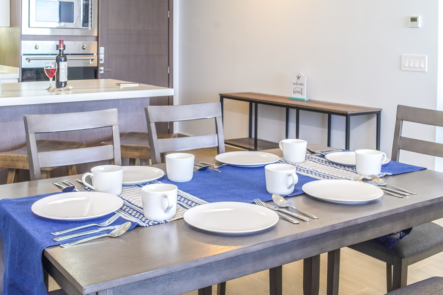 > Leather sofas in the mirrored living room provide comfort for you, your family and friends. Enjoy TV and Wifi. There is also a large dining table set to accept whatever gourmet meals you can whip up in the excellent kitchen. Brand new appliances, all cookware, dinnerware, and gleaming white cabinets present an ideal kitchen for your stay.
