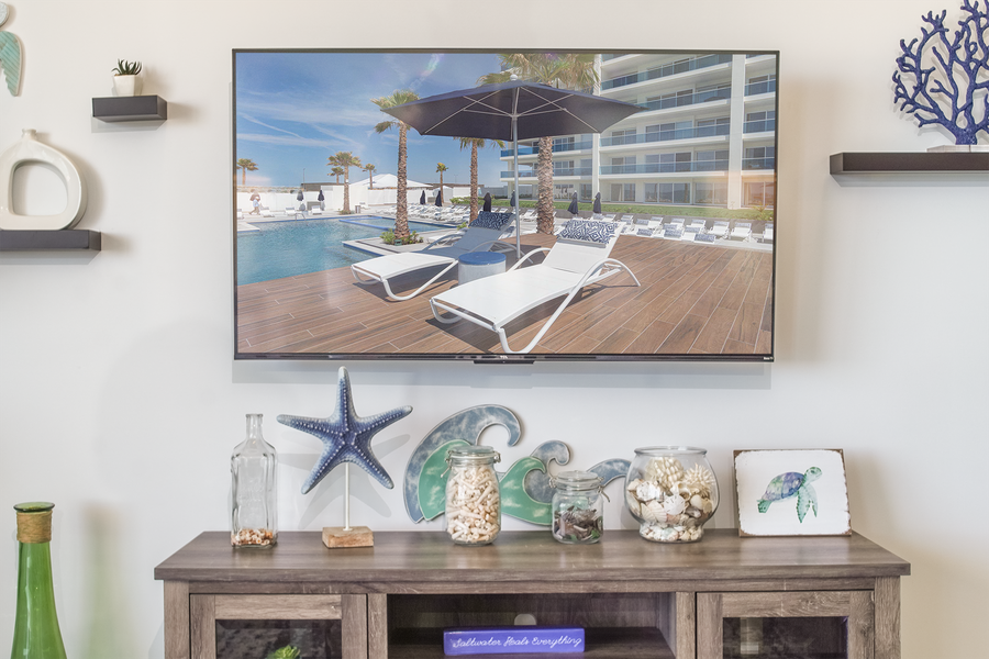 > Two grand bedrooms, each with luxurious King sized beds. The layout allows for sliding glass doors, with access to the breathtaking patio. Enjoy wall mounted TV's, walk in closets and complete bathrooms.