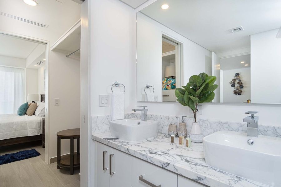 Crisp and white, the unit makes a comfortable space to enjoy Rocky Point beach vacation. The kitchen has fully modern and new appliances, a great large counter work space, along with bar stool seating. To the side is a utility room with sink, washer, and dryer.