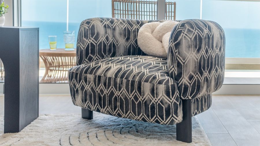 ~Living room with sofa stylish chair, TV. Access the balcony via sliding glass door that opens double wide.