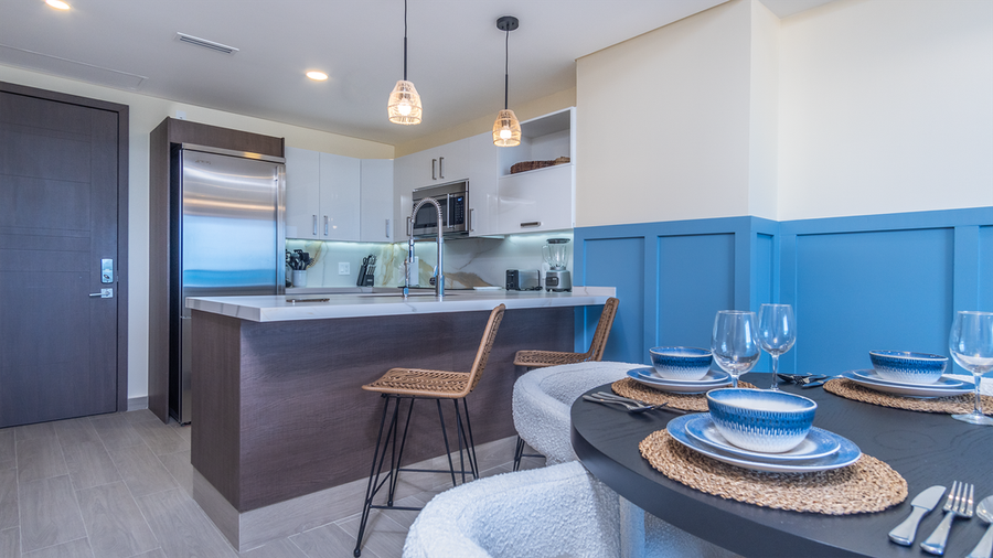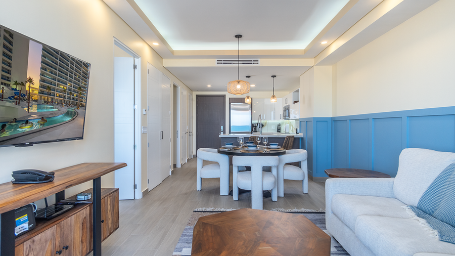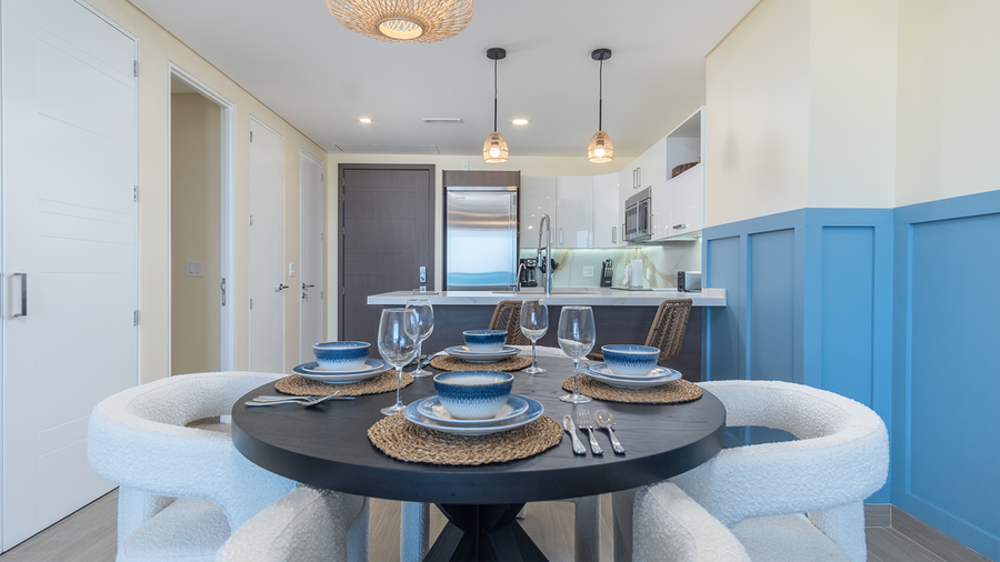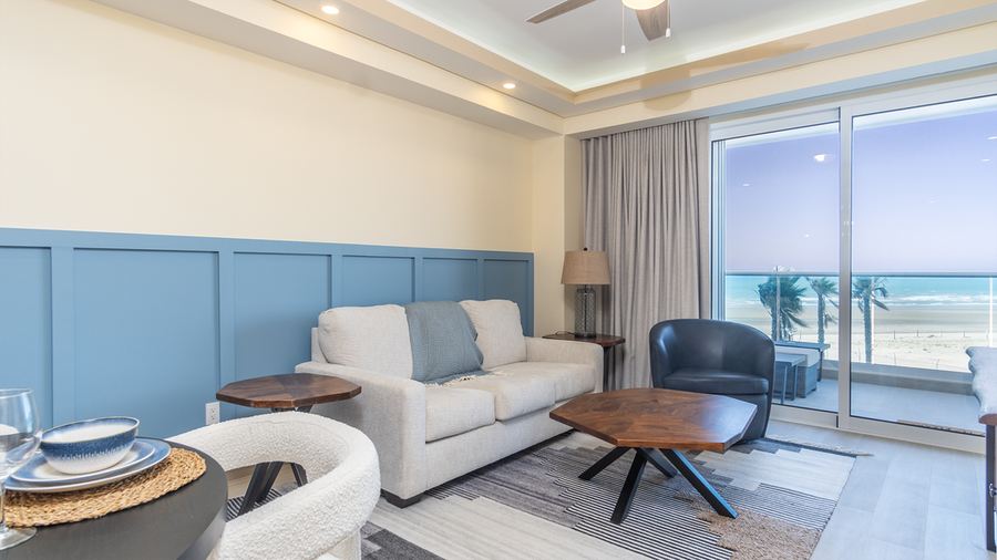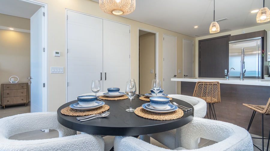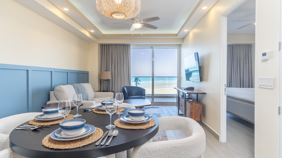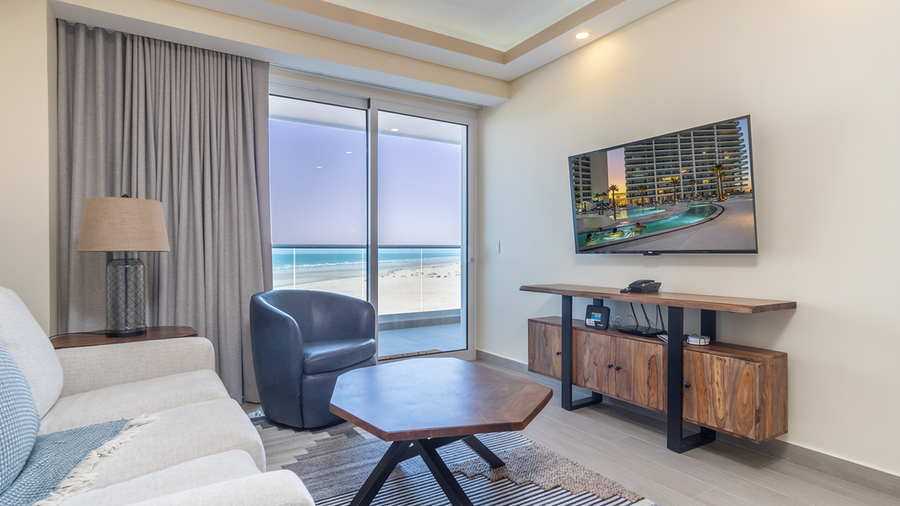 Setting high standards for. a Rocky Point visit, this one bedroom condo at Encantame Towers puts you on a slightly secluded stretch of pure beach. The bedroom, bathroom, and large walk in closet forms a suite for full privacy. Surprisingly large balcony for a one bedroom condo, with a sofa as well as cozy chairs. There is an immaculate kitchen, fully set up, a washer and dryer, sofa TV, and a dining table for foutr as well.