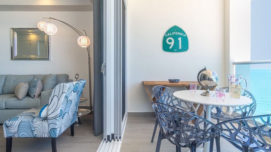 The living room is bound by floor-to-ceiling windows that provide views of the world outside, and create access to the furnished balcony. A custom image adorns the ceiling, bounded by reset lighting. Here you will encounter two comfortable chairs With hassocks, a side table, and a dining table for four. Views here are otherworldly!