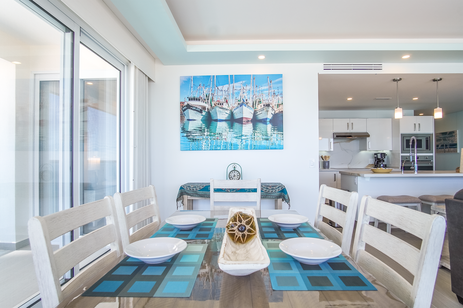 The main living room features leather sofas and a large TV, and the dining table is right where the windows all meet, making a setting for dinner that can not be topped.