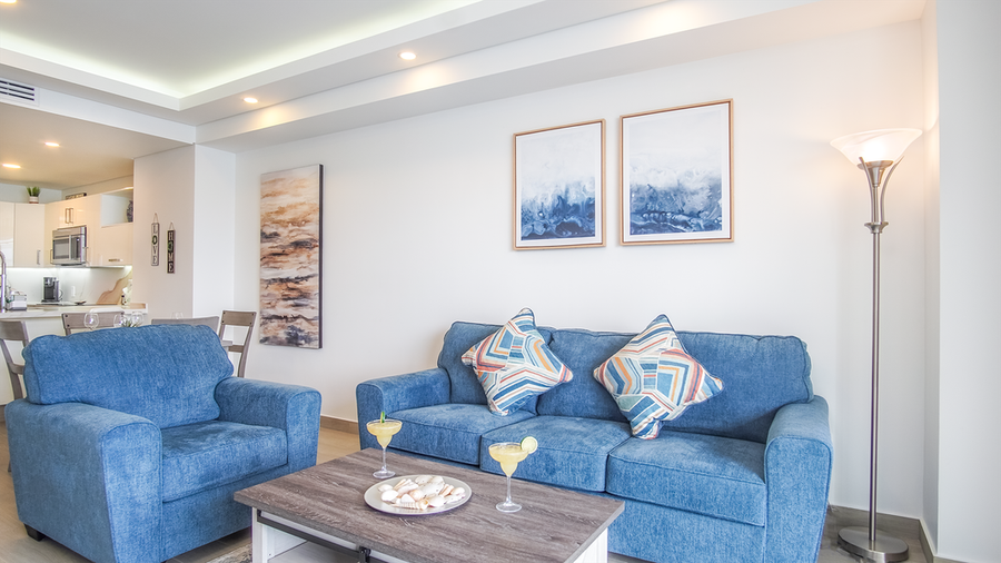 The living room gives you views of the Resort and the inviting waters of the many pools and beaches. There is a large wall-mounted TV, upholstered Queen Sofa Sleeper and chair, along with coffee and side tables.