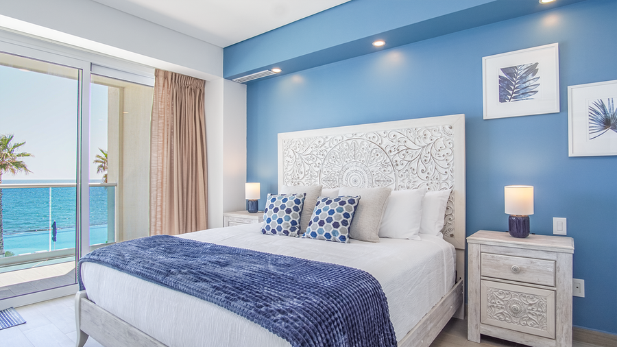 The bedroom is its own private suite, with individual access to the balcony as well. It has a stylish and comfortable king-sized bed and a wall-mounted TV. A walk-through closet has plenty of storage space and takes you to the bathroom. Here, you will find a glass-enclosed shower, spacious double sink vanity, and large mirror.