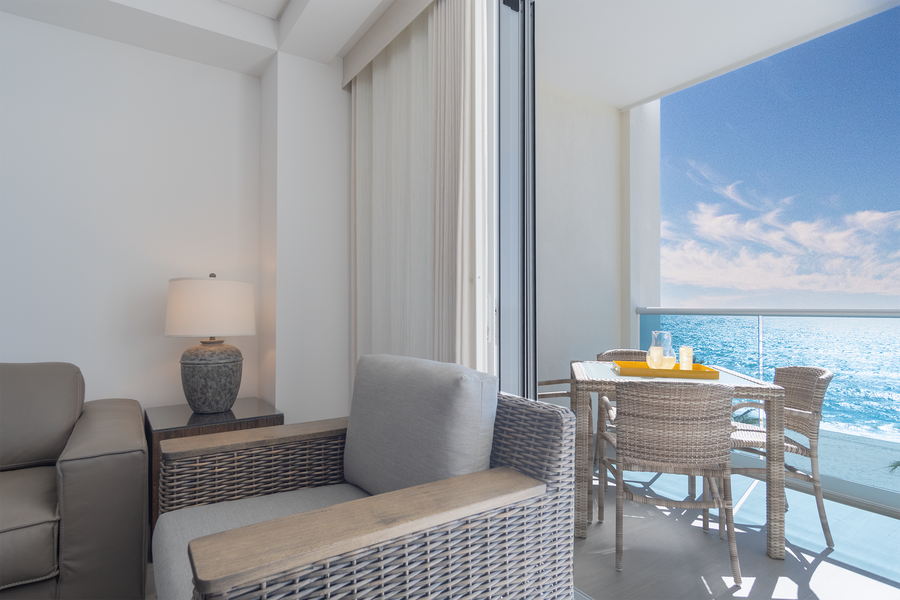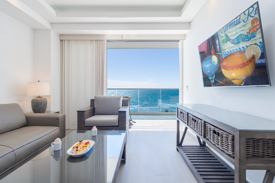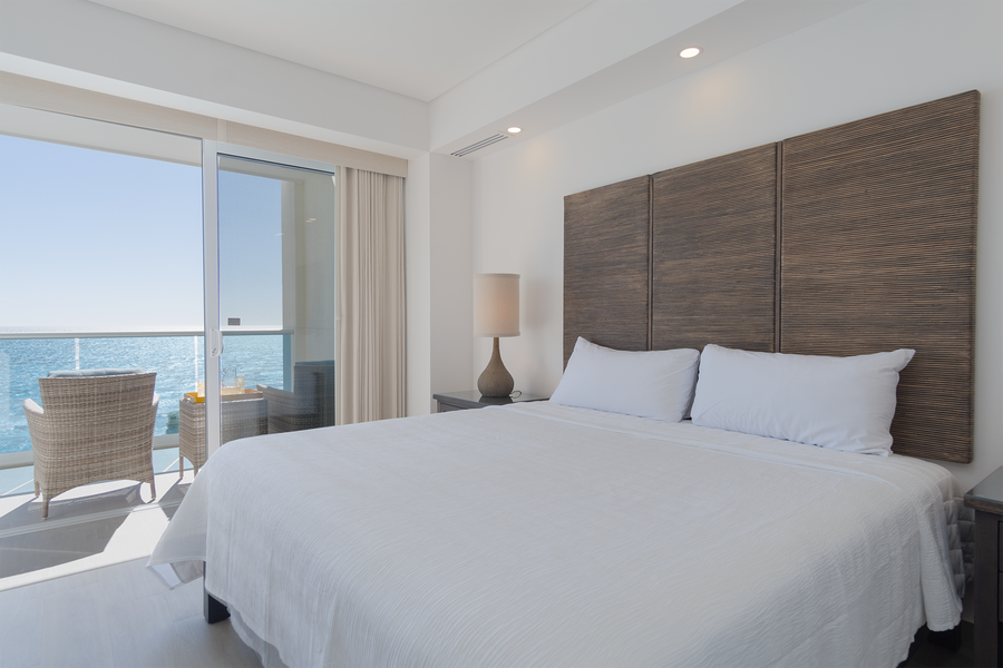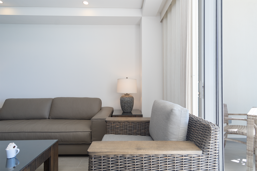 This one bedroom unit oozes minimalist style. There is a modern kitchen with excellent appliances and all needed plates, pots and pans and more. Tucked away is a stacked washer and dryer. The comfortable living room seating area has sliding doors that open onto the patio, with its beach views. The patio has both a seating area, as well as a dining table.