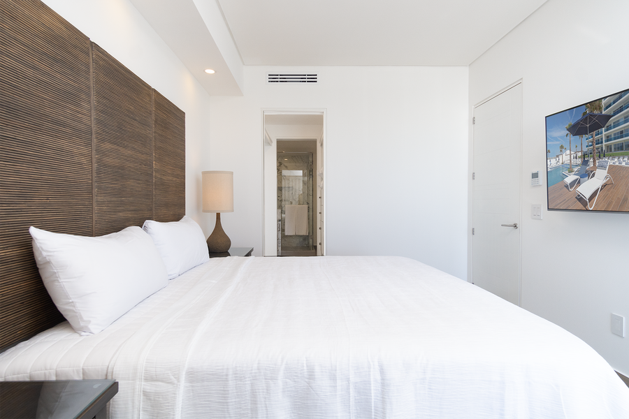 The bedroom has a King sized bed, patio access, and a walk-though closet to the bathroom. There is a marbled double vanity sink and a glass shower stall here.