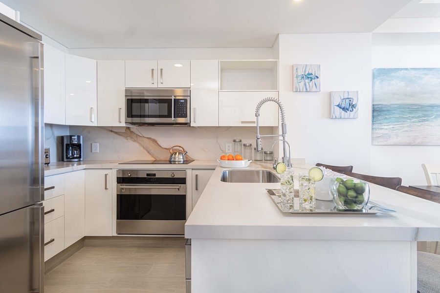 Your kitchen has it all for your stay. Beautiful stainless steel fridge, microwave and oven are incorporated into clean, white, marbled countertops. The bedroom has a sumptuous King bed, along with recessed ceiling lights and independent access to the patio, and bathroom.