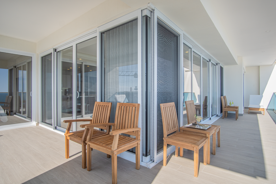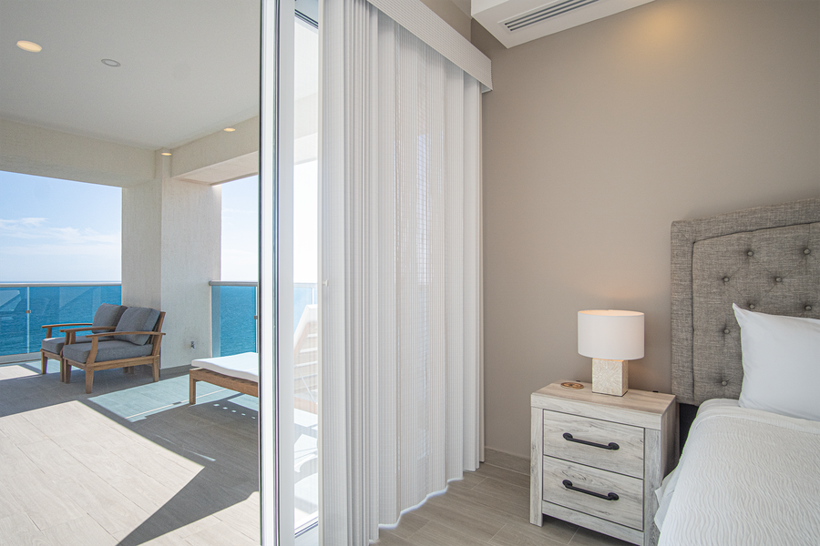 ~ Three bedroom suites, two with private terrace access, King beds, wall-mounted TVs, walk-in closets, and luxurious bathrooms. Both offer glass shower stalls and double sink vanities. The third bedroom has a Twin bed, walk-in closet, and attached bathroom as well.
