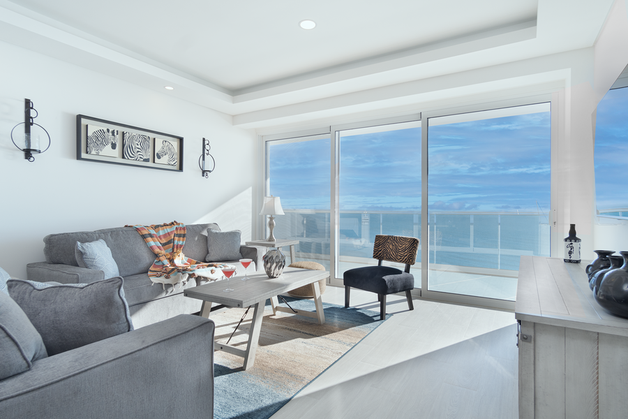 Both bedrooms in this unit face the ocean, and have glass doors that open onto the patio. Here you will find an L shaped sofa for enjoying the afternoon breeze. The main living area is comprised of a seating space with TV, dining table for six, and great kitchen with all appliances.