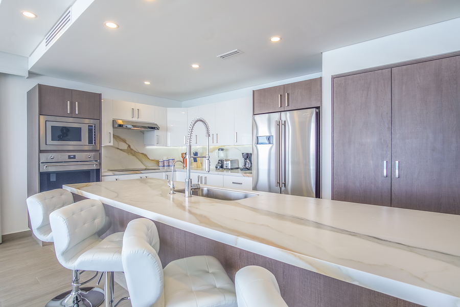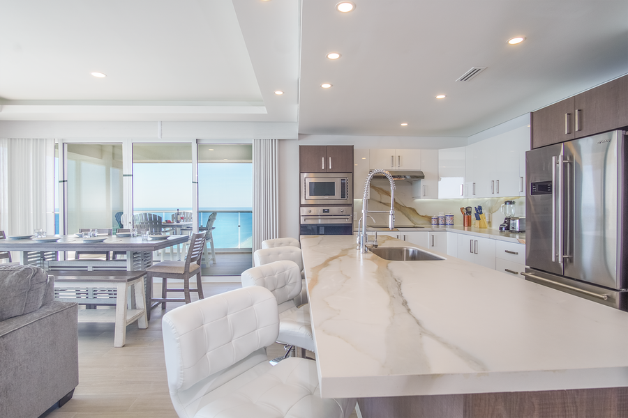 Encantame 1801 Velero has three bedrooms. Two are ocean front. King beds, TV's walk in closets and separate patio access in both. Both have stylish bathrooms with glass enclosed showers, and granite style vanities. The Third bedroom features a Queen bed, TV, and its own attached bathroom.