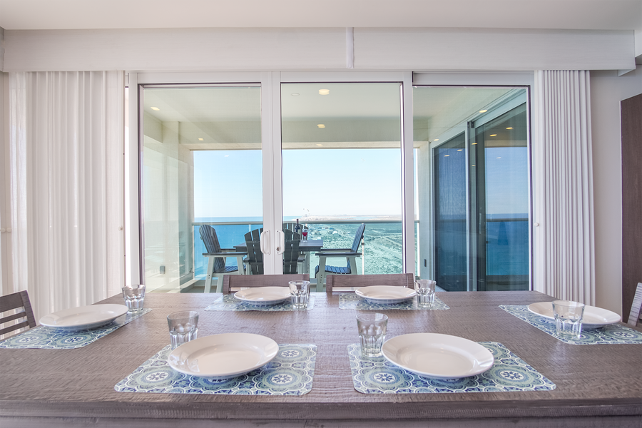 A wall of windows frames the main room, bringing in views from two sides of the unit. The patio has a raised cafe table for four, and there area also comfortable Adirondack style chairs as well.