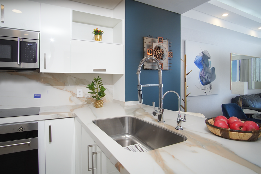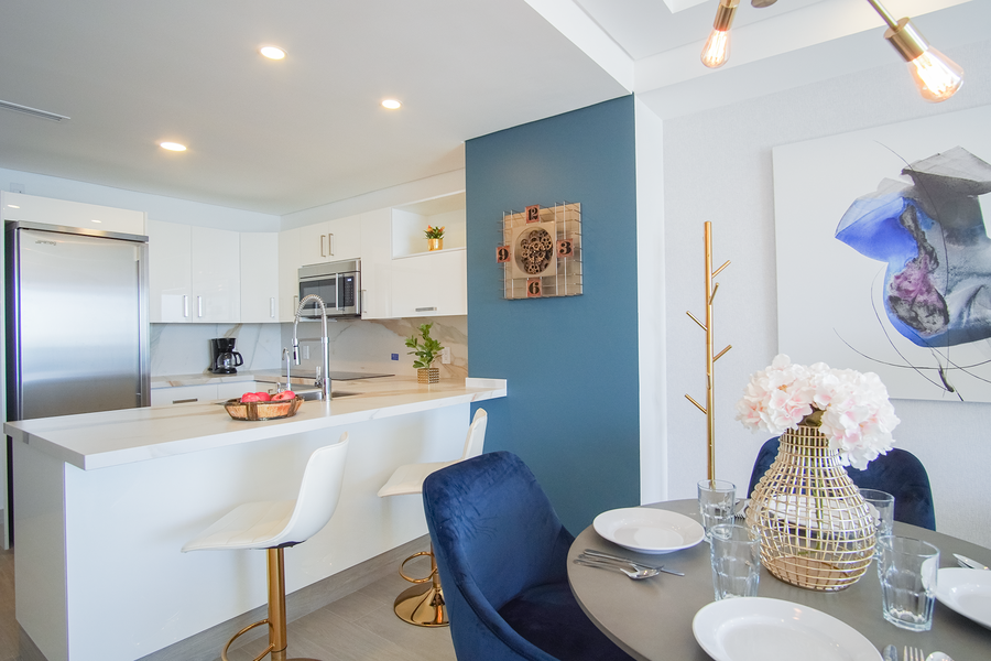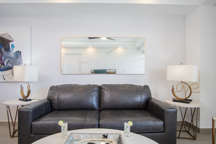 Designed with contemporary decor and furnishings, this sleek unit boasts an open floor plan with seating area, high end kitchen, dining table, and double sliding doors that open onto the patio.