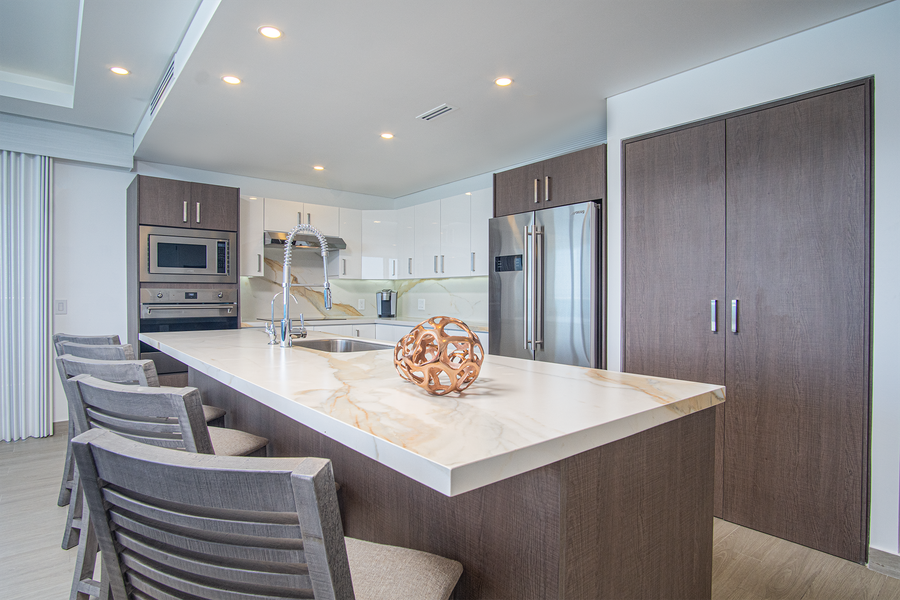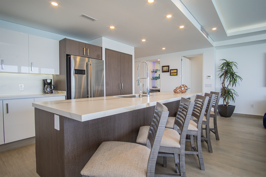 ~ Truly a luxury kitchen the appliances, dinnerware, and cookware are all you need. The kitchen island is very large, with high backed bar stools