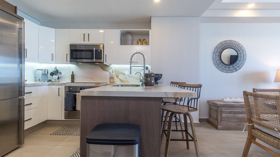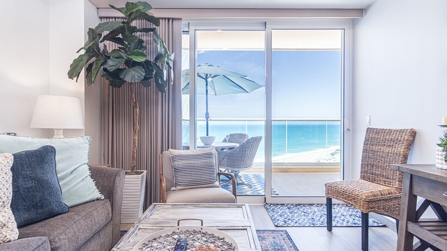 Exceptional one-bedroom condominium with comforting style, a great full balcony, comfortable king bed in the bedroom, and a large complete kitchen as well. The bedroom suite brings together a King bed, balcony access, TV, and walk-in closet that connects to the bathroom, Here you encounter a shower, and double sink vanity. There is a separate room for the washer and dryer, and the kitchen is new and complete with all appliances, a coffee maker, dining table, and bar stools at the counter. The balcony offers great comfort. There is a dining table for four, topped with its shade umbrella. Views are terrific of the beach below.
