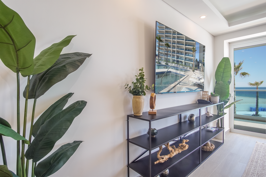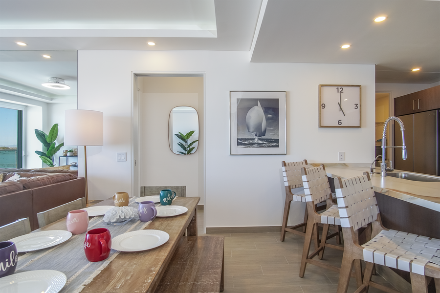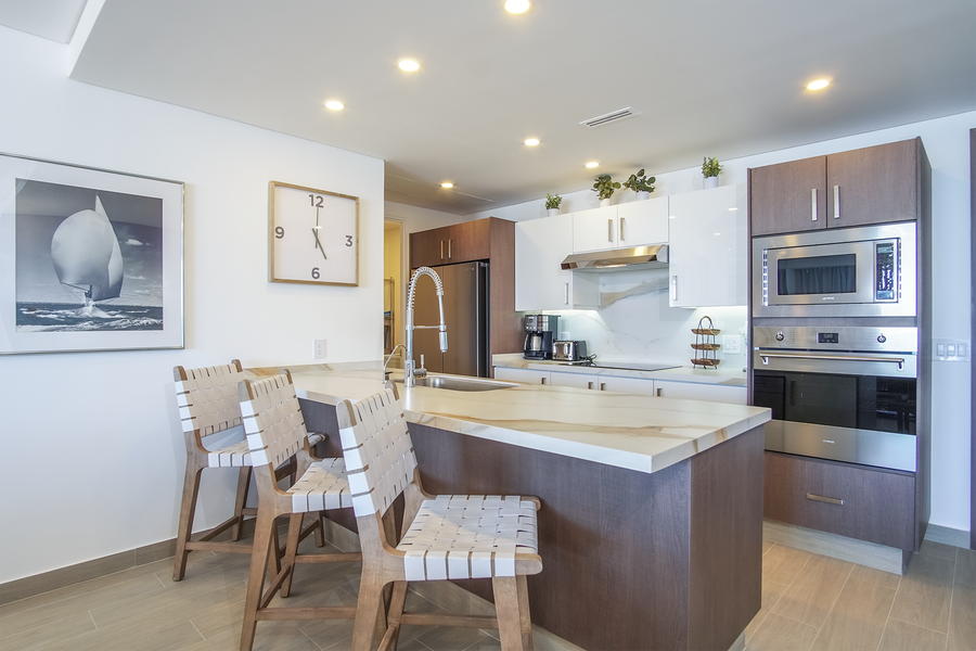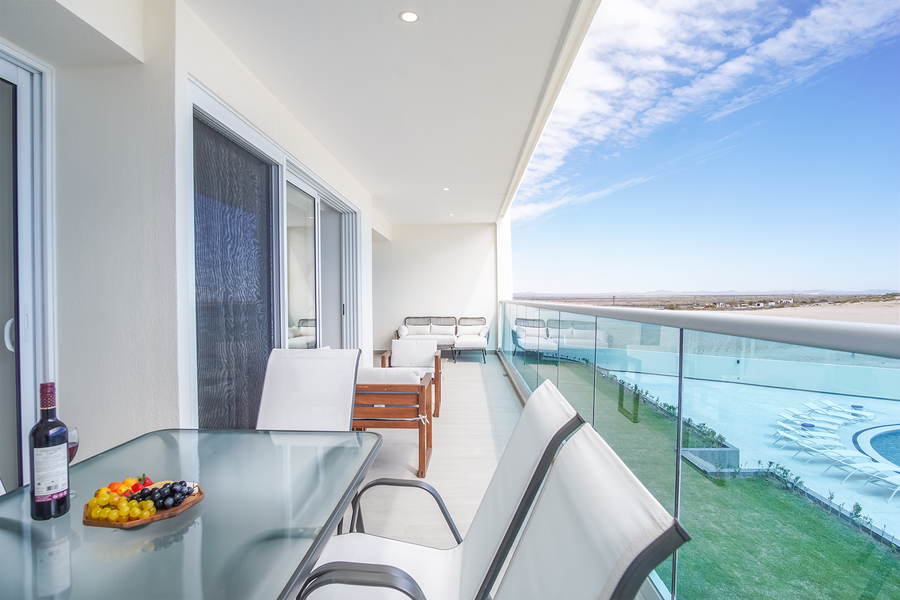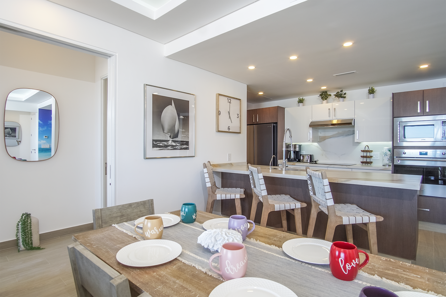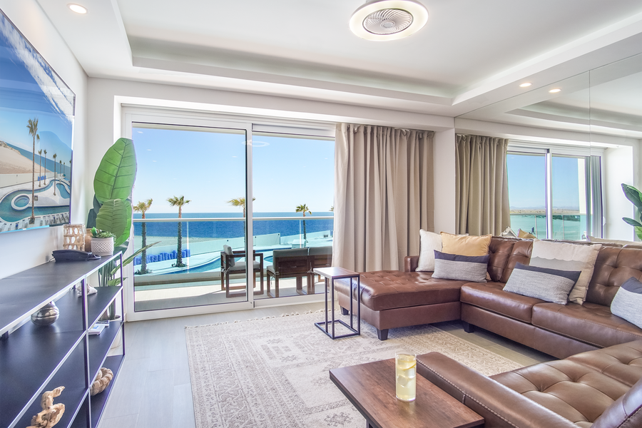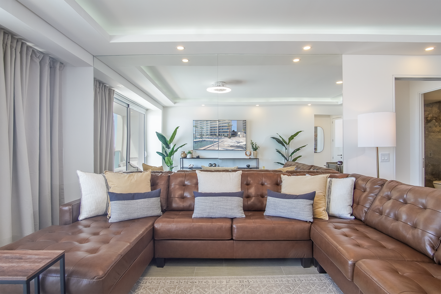 Enter the unit you are greeted by the spacious kitchen, with its large counter and seating, and complete appliances. The living room is set around a C shaped leather sofa, and has a TV and additional seating by the patio glass door. The patio brings together a two seating area, one sofa, as well as a dining table.