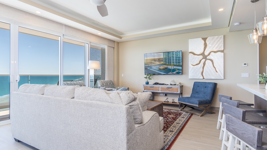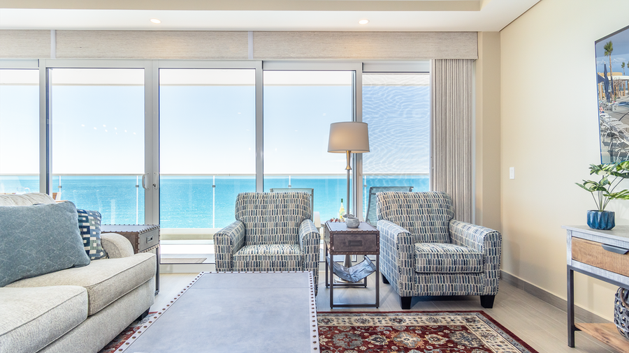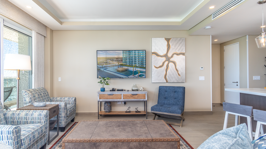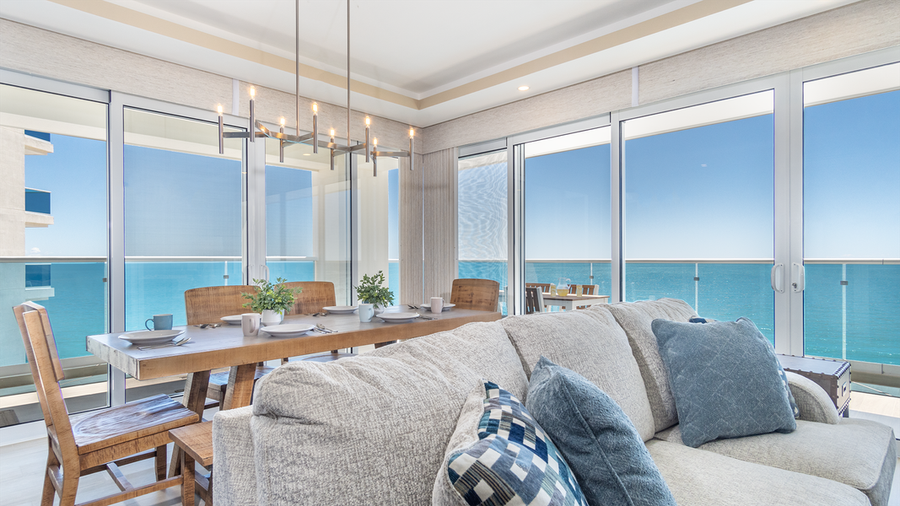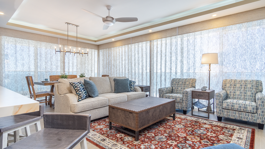 Upon entering, you are greeted by the expansive living space, where you will find the living room, kitchen, and dining area. All of this is enclosed by the unit's many windows, which include double sliding doors that open up and connect the balcony with the interior living space. A large, comfy sofa and two tailored easy chairs adorn the living room, with its wall-mounted TV above the entertainment center.