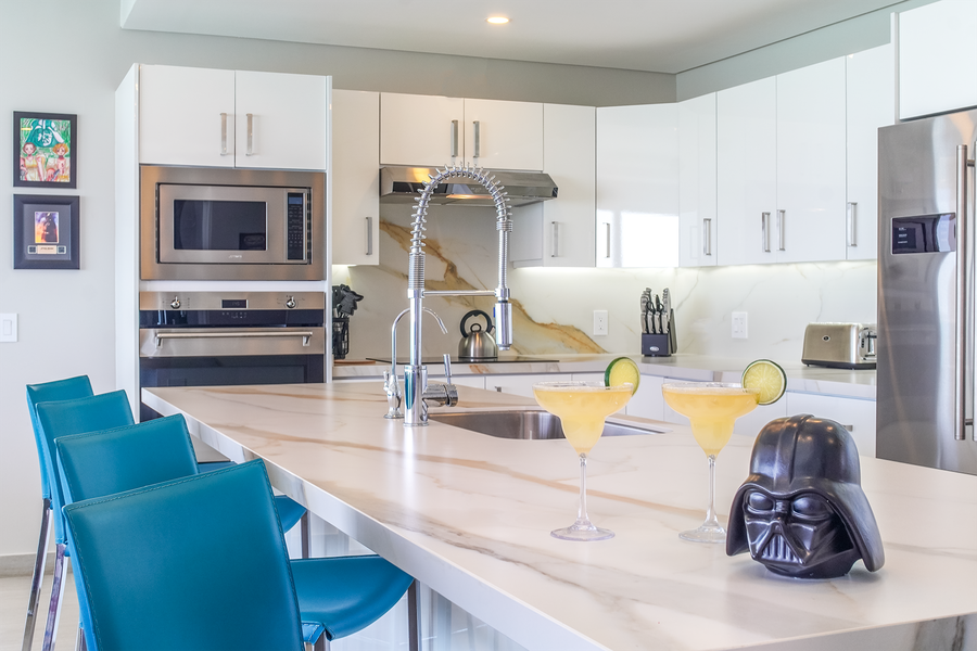 ~ Luxury Kitchen with new appliances, all dinnerware, full cookware, sleek cabinetry, and a separate kitchen Island with high backed bar stools