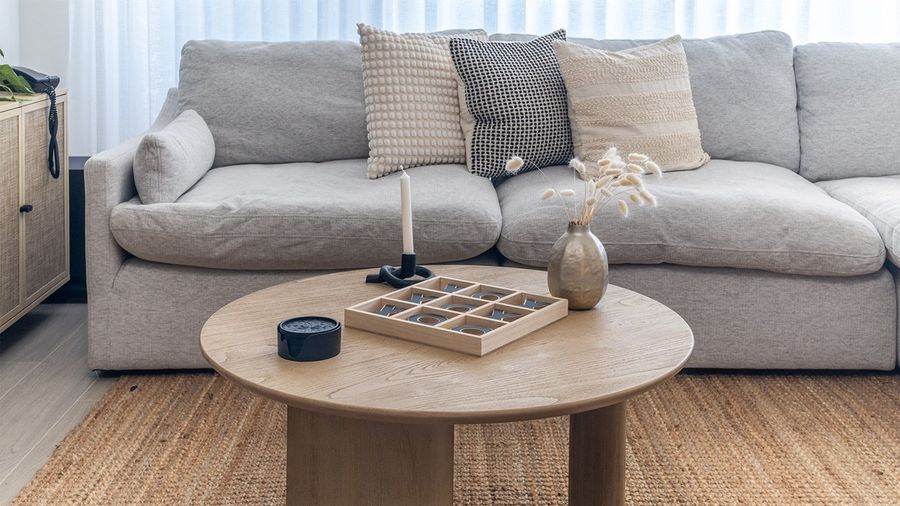 ~ The living room has a large sectional sofa, TV, and entertainment center.