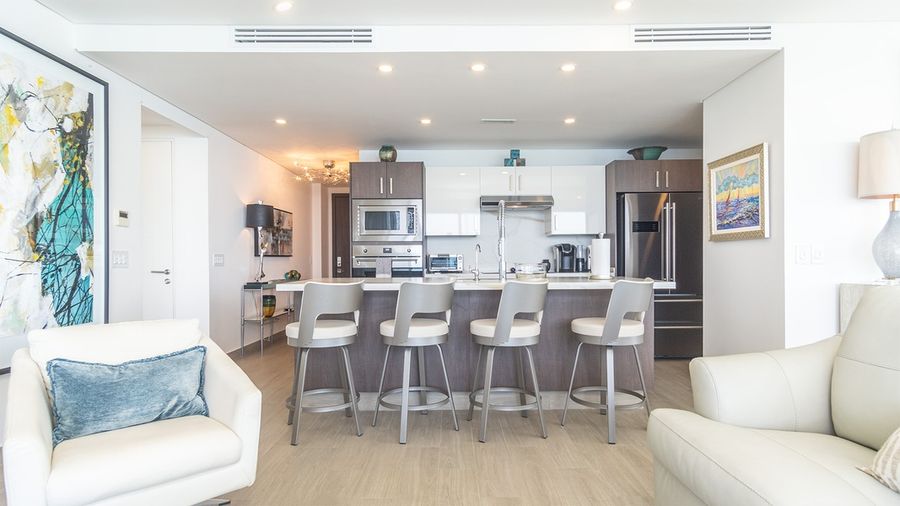 Enjoy the expansive living room space that is enclosed by floor to ceiling windows on two sides. The kitchen offers high end appliances, and a socials island lined by raised bar stools. There is a separate utility room housing a washer and dryer, along with a sink.