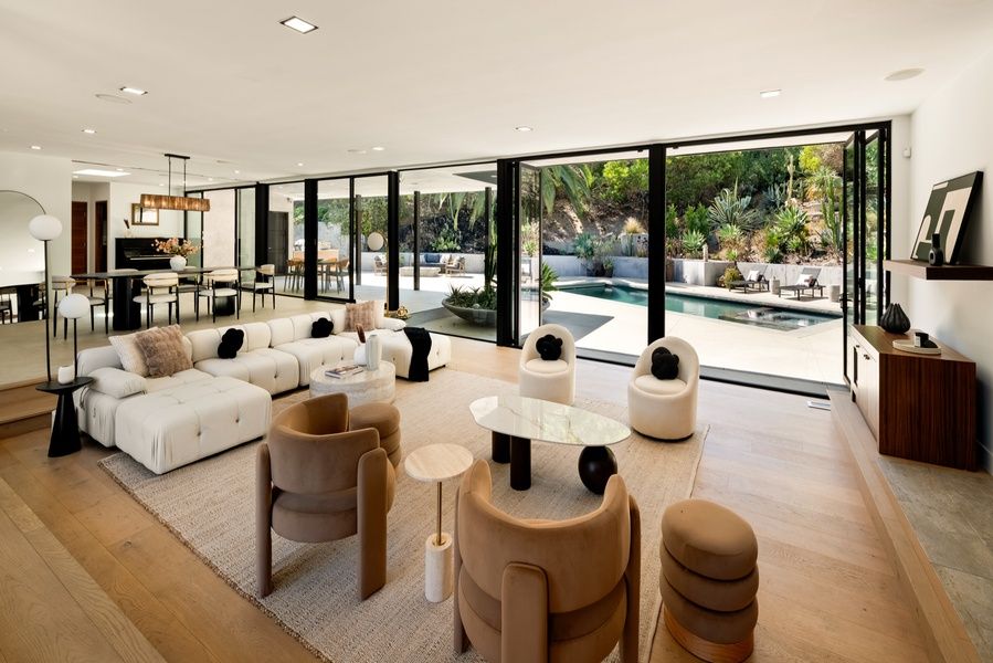 Every inch of this 5-bedroom, 7-bathroom estate (featuring 4 full and 3 half baths) has been thoughtfully curated to perfection, showcasing global materials and designer finishes that create a timeless yet cutting-edge aesthetic. The home’s open layout invites natural light and effortless indoor-outdoor flow, perfectly framing views of the surrounding greenery.