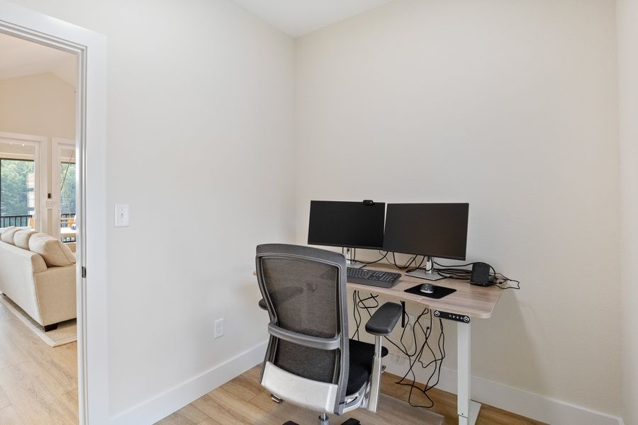 • Modern Workspace Upstairs: Desk, Chair, Dual Monitors, and a USB-C Laptop Dock