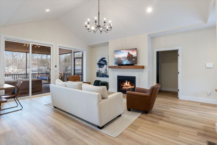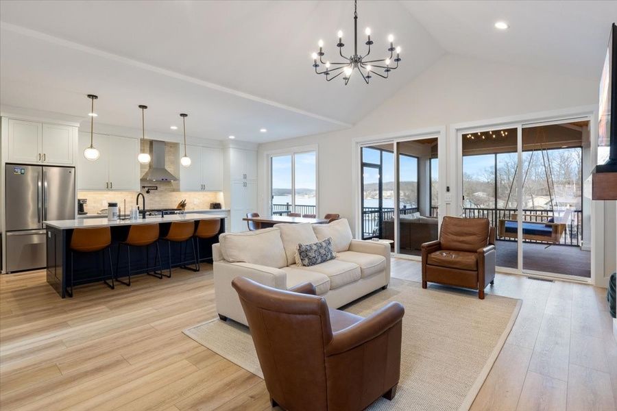 The home has a bright and airy atmosphere thanks to the generous open floor plan with cathedral ceilings. The upper deck features a screened-in porch and a cozy daybed swing, perfect for unwinding with a book or a nap. The kitchen features a large island with beautiful quartz countertops and walks out directly to the grill. Designed for fun and relaxation, the spacious lower level includes a Tornado foosball table, a Golden Tee machine, and a wet bar. Or just settle into the huge La-Z-Boy sectional and catch a movie on the 65-inch TV. (If needed, the sofa converts into a full bed for extra sleeping space.)