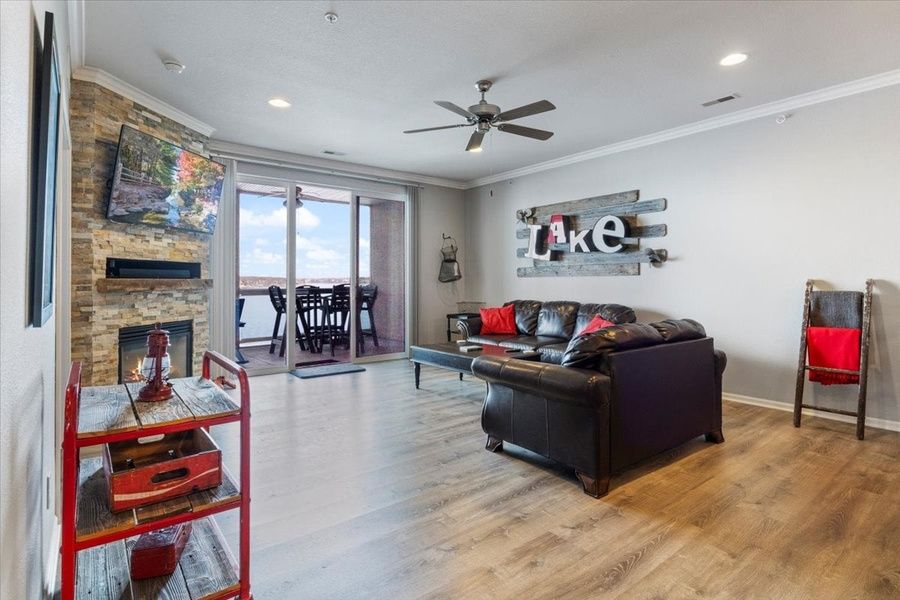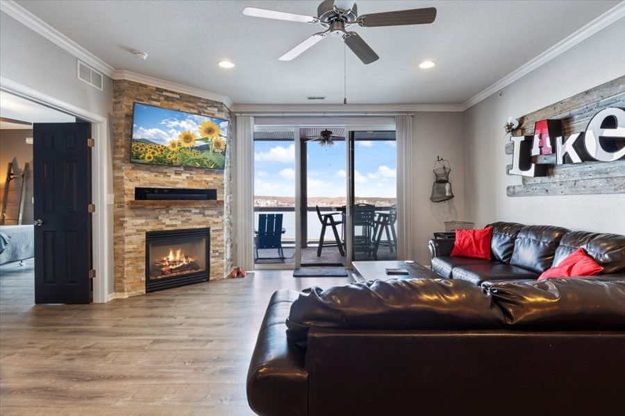 Welcome to Good Vibes Lodge! Nestled on the 19mm Main Channel of Lake of the Ozarks, this charming 3rd-floor condo in the Lands End community offers stunning, panoramic views from its spacious balcony. Relax and enjoy miles of breathtaking lake scenery. Guests have access to a variety of amenities, including a huge pool, a separate lazy river with a splash pad, a basketball court, a clubhouse with a pool table and gym, and a community dock with an available 16x48' boat slip. Just minutes away from some of the lake's most popular dining spots like Wobbly Boots, Dog Days, Backwater Jacks, 1932 Reserve, and Vista Grande. Plus, you're a short three-minute drive to the soon-to-open Oasis on the Water. Whether you're in town for the Lake Shootout or simply looking for a relaxing getaway, Good Vibes Lodge offers the perfect combination of incredible views, top-notch amenities, and convenient proximity to all the entertainment, shopping, and dining you want.