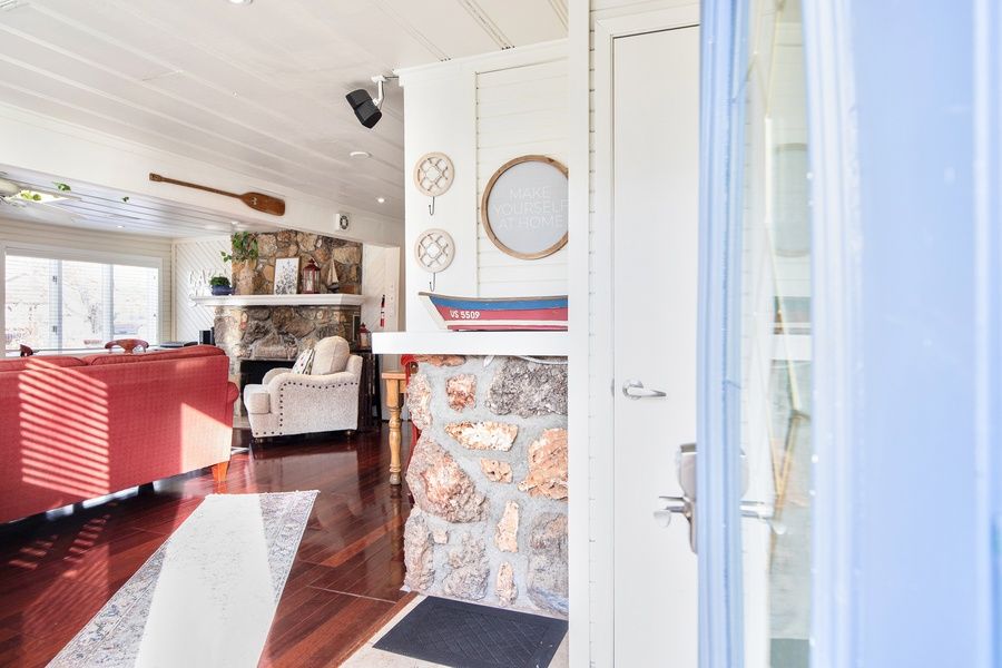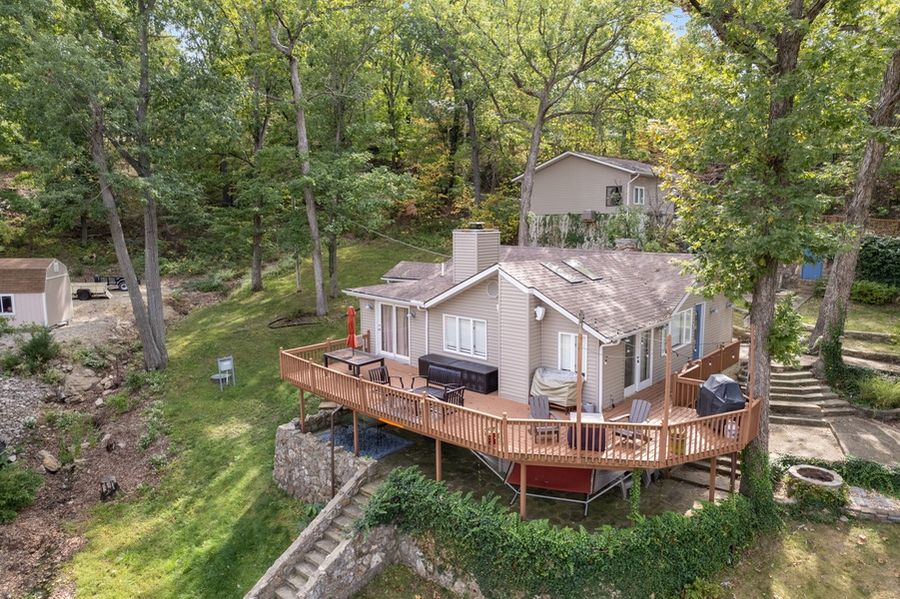 Experience vintage Ozarks design through this 1930s home fully renovated for your vacation experience. The home is complemented with Ozark stone throughout and unique skylights can be found in the master, kitchen, and living areas. This 3 bedroom, 3 full bath home sleeps 8 guests plus up to 2 pets comfortably with parking for up to 5 vehicles and a 24-foot boat trailer. Access to the home from the parking area is through a stairway that includes both stone stairs and standard stairs. There are additional stairways inside the home, including a spiral staircase and from the deck to the lake area.
