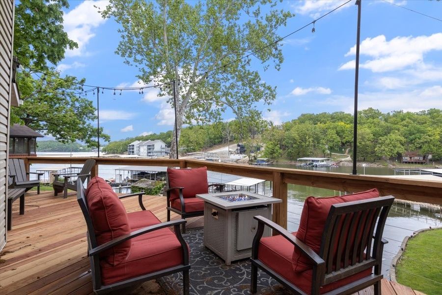 The home is located on lake mile marker 19 of the main channel, and one mile down the Grand Glaize arm in a private, NO WAKE cove. Our cove is perfect for fishing, swimming, and kayaking right from our dock. You can grill out on the deck, swing in the hammock, sit around the fire pit, or stroll down the gentle slope to the private dock to watch the sunset. If you are looking for fun on the water, the home has 2 kayaks, a swim mat, water steps, and fishing gear.